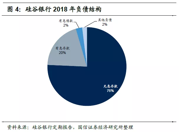 除贷款结构与其他商业银行差别很大外,硅谷银行的存款也与其他银行有别,硅谷银行存款中无息存款占比远远高于其他银行。2018年末硅谷银行存款中有79%是无息存款,而全部商业银行中这一比例仅为23%。而且,硅谷银行无息存款占比高并非其刻意压低有息存款导致,而的确是因为存款吸收能力强,因为硅谷银行的无息存款/净资产高达7.4x,而全部商业银行的无息存款/净资产仅有1.6x。这主要是因为硅谷银行专注PE/VC行业与高成长性公司,因此其服务更加贴合这些企业的需求,比如账户办理手续更加简便等,从而获得了大量客户青睐,带来很多低成本存款。
