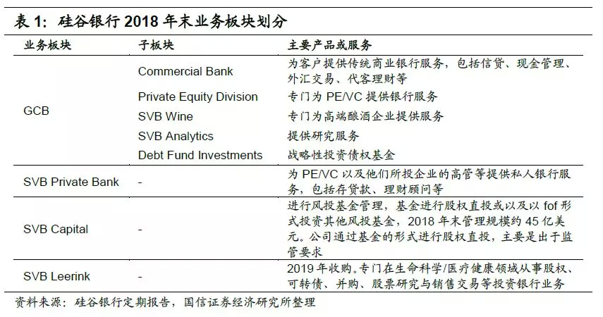 从业务划分来看,硅谷银行将其业务划分为四大板块:Global Commercial Bank(GCB)、SVB Private Bank、SVB Capital、SVB Leerink。各个板块的具体情况如下: