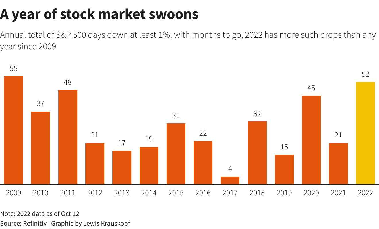 可以肯定的是,今年美股出现更多的是下行走势。自2009年以来,今年标普500指数跌幅大于1%的次数是最多的。