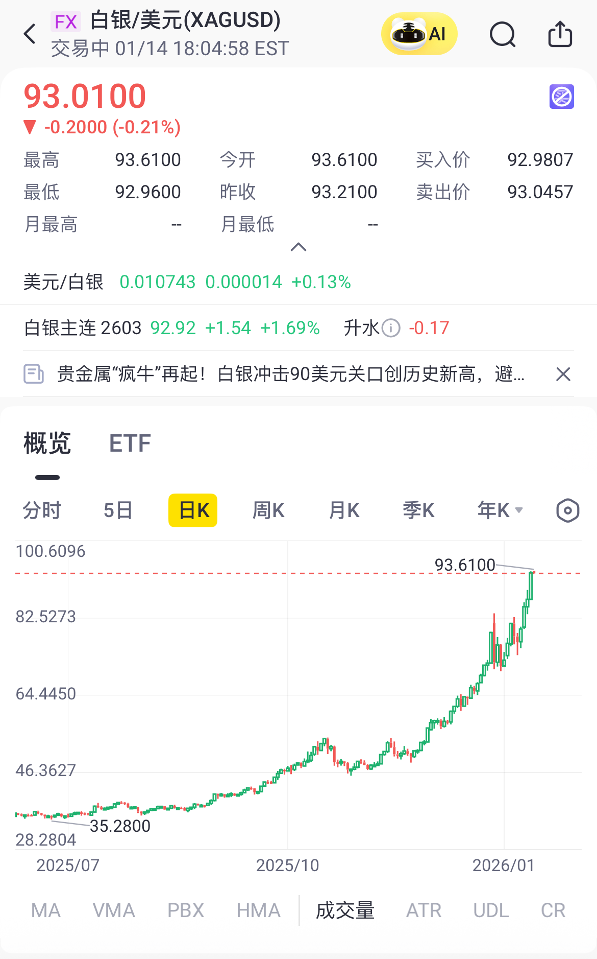 白银再创新高,现货白银、期货白银冲破93美元