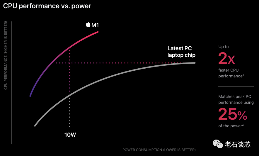 苹果在发布会里放出了这张图,它比较的是M1芯片和某个笔记本的CPU,但苹果没说是谁。为了方便叙述,这里姑且叫它“张三芯片”。在这张图里,横轴是功耗,纵轴是性能。可以看到,对于一个给定的功耗标准,M1的性能是张三的两倍。对于一个给定的性能要求,M1的功耗是张三的四分之一。