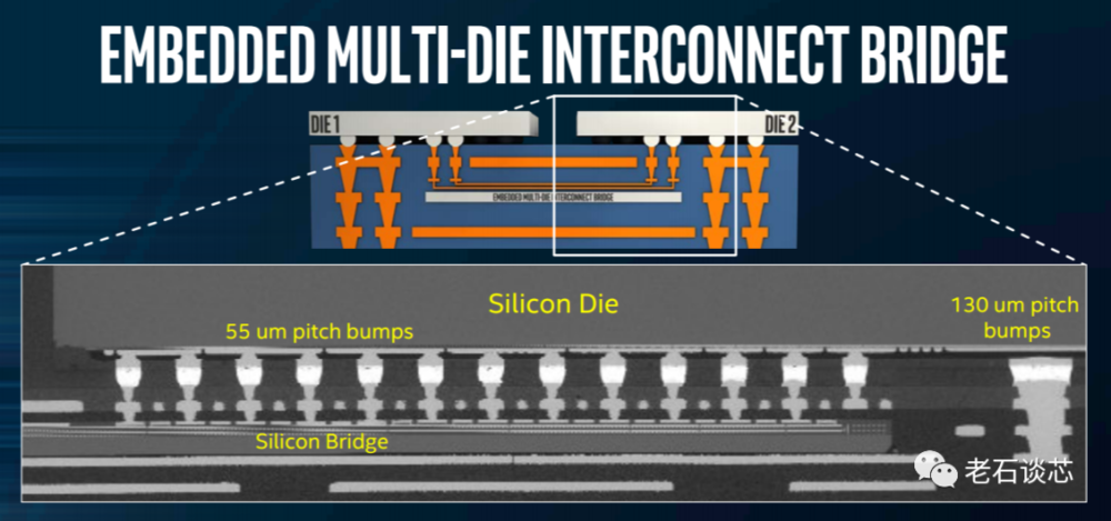 这种封装方式的具体的实现方式有很多种,比如AMD使用的芯粒chiplets,还有英特尔的EMIB技术,还有赛灵思在FPGA中使用的SSI,也就是堆叠硅片互联技术等等。业界把这些技术都称为是2.5D封装技术,也就是是在水平方向上连接多个小硅片,然后组成一个大的芯片。关于EMIB和SSI技术的具体分析,可以看之前写过的这两篇文章《3D FPGA技术——上篇》《3D FPGA技术——下篇》。