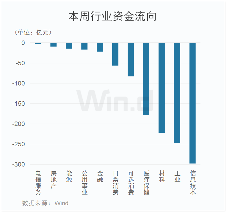 从本周行业资金流向来看,主力资金净流出1100多亿元,所有行业净流出,其中信息技术板块净流出额超过250亿元,位居首位;工业、材料、医疗保健板块净流出额亦较大,均超过150亿元。
