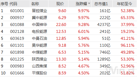 从采掘板块个股表现来看,晋控煤业、冀中能源涨停,中国神华、电投能源、昊华能源、中煤能源、陕西煤业等个股亦涨幅居前。