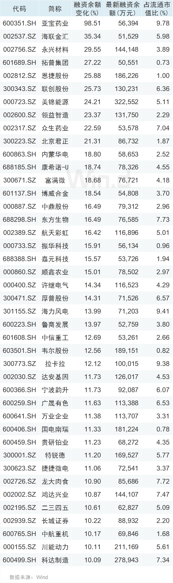 两融余额震荡的同时,部分公司融资余额却大幅增长。Wind统计显示,本周前4天,有42只个股融资余额增长超过10%,最新融资余额超5亿元。具体来看,亚宝药业融资余额增幅达98.51%,位居第一;此外,海联金汇、永兴材料、拓普集团、恩捷股份、联创股份、美锦能源、领益智造、众生药业、北京君正等多家公司融资余额增幅均超过20%。