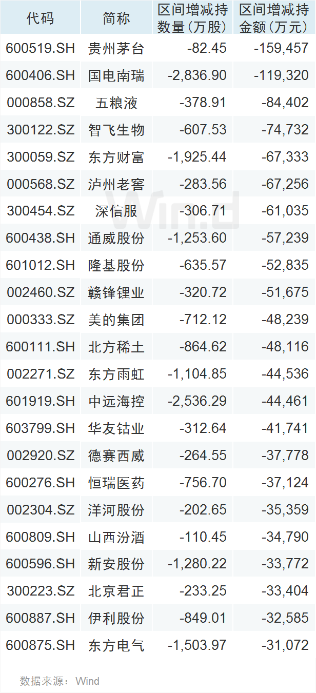 虽然北上资金本周整体买入,但部分公司依旧大幅卖出。有23家公司净卖出金额超3亿元,贵州茅台被卖出超15亿元,位居首位,此外,国电南瑞、五粮液、智飞生物、东方财富、泸州老窖、深信服、通威股份、隆基股份、赣锋锂业卖出金额亦过5亿元。