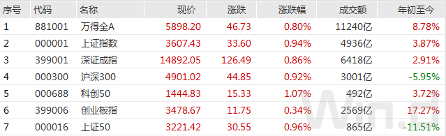 截至12月3日收盘,上证指数涨0.94%报收于3607.43点;深成指涨0.86%报收于14892.05点;创业板指涨0.34%报收于3478.67点,万得全A总成交1.12万亿。