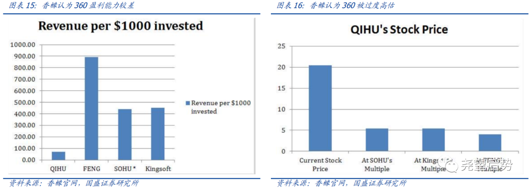 其次,香橼选择搜狐、凤凰网与360进行对标也并不合适,三家公司并非直接竞争对手,特别是在商业模式上更是完全不同。