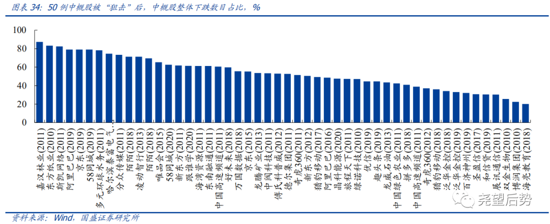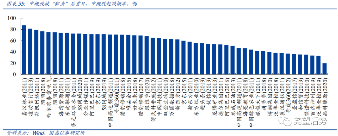 与此同时,个股被做空对中概股整体波及效应显著。以做空后首日涨跌幅为判断标准,2011年嘉汉林业被浑水做空后,约有87%的中概股随即收跌,波及范围位居首位;而且,波及范围最小的一轮,即2011年海亮教育被香橼做空后,也约有20%的中概股在之后呈现下跌。而平均而言,约有53%的中概股会随之呈现不同程度的下跌,波及效应明显。