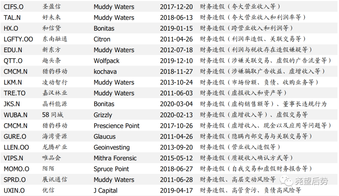 与此同时,今年初以来中概股财务造假“幺蛾子”确实频发。从1月31日浑水质疑瑞幸伪造公司财务和运营数据,到4月2日瑞幸坐实财务数据造假。随后,好未来自曝员工伪造合同夸大销售数据,爱奇艺也遭到浑水和Wolfpack的做空。连续的事件让中概股做空再次进入市场的视线,更重新引发对于国内引入做空机制的讨论。海外机构做空真的如此准确?它们又是如何在多如繁星的样本中寻找到“猎物”的?本篇报告通过梳理被海外做空机构做空过的中概股,探讨并归纳做空机构背后的“套路”,以帮助投资者避开“陷阱”收获“真金”。