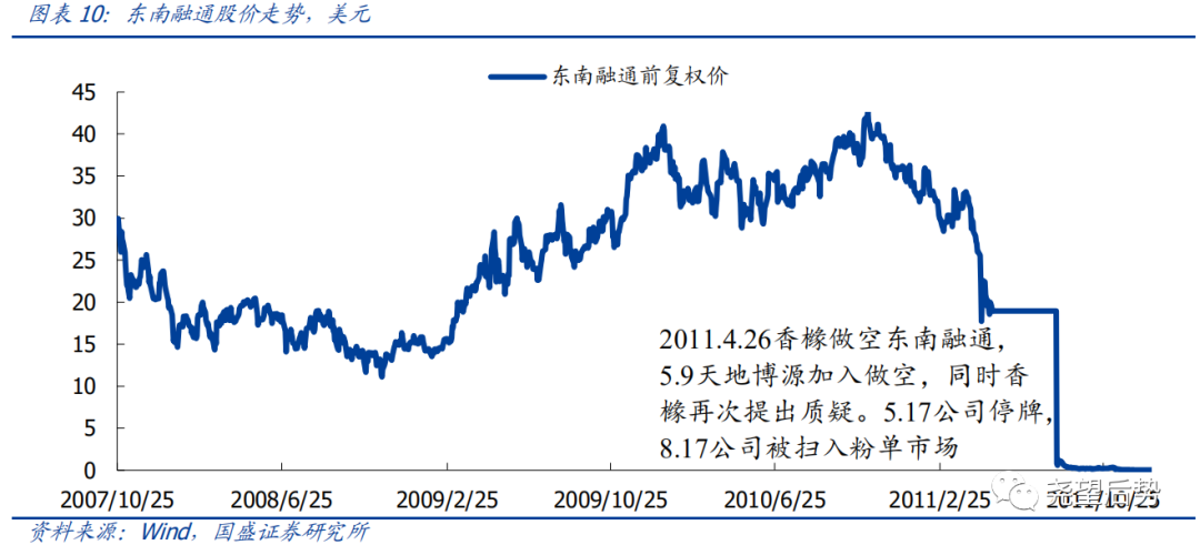 2011年7月下旬,因涉嫌财务造假、无法提供财报等原因,纽交所对东南融通启动退市程序。8月17日,东南融通正式退入粉单市场,股价暴跌95.9%至0.78美元,市值也仅余下0.45亿美元。8月24日,美国SEC向东南融通发出“韦尔斯通知”,指控公司违反美国证券法。8月31日东南融通正式宣布解散。而此时,距离香橼发布做空报告仅过去4个月零5天。
