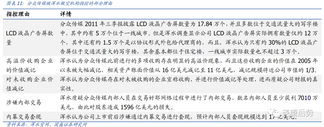 2011年11月21日,浑水发布“强烈卖出”研究报告,该报告从LCD液晶广告屏数量、高溢价资产减记、内部交易、内幕交易套现等多个方面质疑公司质量。报告发布当日,公司股价大幅跳水,日内曾一度下跌65.53%,股价刷新了两年新低。