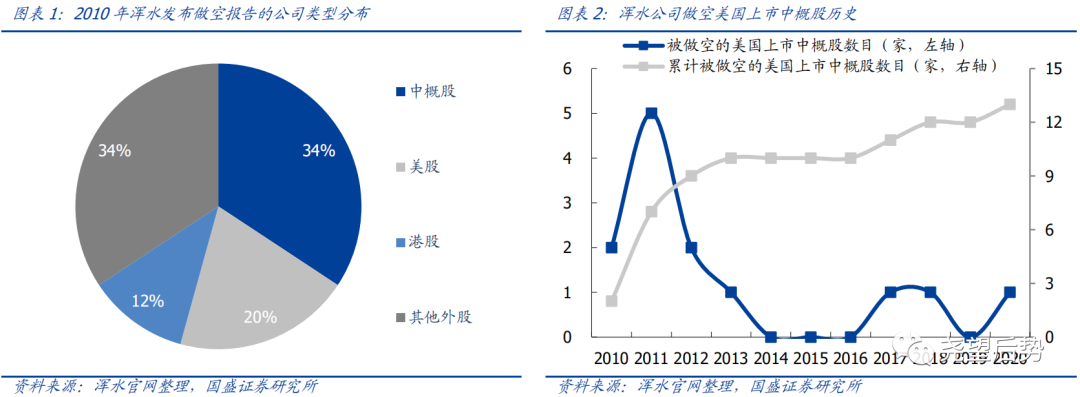 以近期热度较高的浑水(Muddy Waters Research)为例,自2010年成立以来,已经发布了近百篇研究报告。这其中,中概股更成为浑水公司做空的重要对象,在成立早期更一度自诩为专注于从基础面研究中国概念股的研究组织。在其做空的30多家公司中,中概股有13家,占比约为3成。其中2010年成立之初,浑水便连续做空东方纸业和绿诺科技得手,一举奠定其顶尖做空机构的低位,更掀起了做空中概股的热潮。