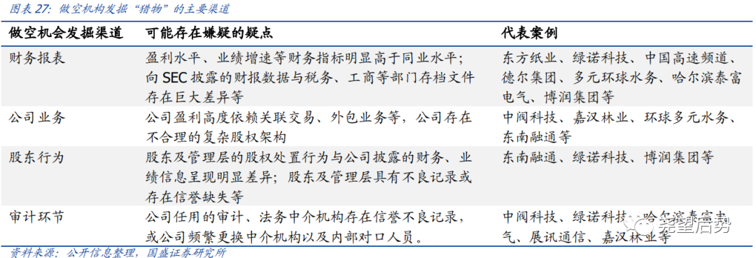 其次,做空机构是如何在众多的标的中锁定做空目标的?通过对上述50例做空案例的分析,我们认为财务造假和信息披露问题通常是中概股被做空机构“狙击”的主要原因。而做空机构早期发掘做空目标的过程,大致以下四个渠道实现:财务报表、公司业务、股东行为和审计环节。这往往是做空机构发现并调查的入手点。