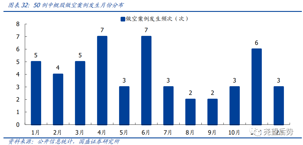 最后,中概股做空潮还具有一定的“日历效应”。市场情绪是做空的重要推动力。做空报告的发布实际上只是扣动了“狙击”行动的扳机,真正打压股价的是随之而来的业绩暴雷,以及证监会审查和后续诉讼的推波助澜。因此,选择合适的时间点进行做空在很大程度上影响着最终的收益。根据我们搜集的50个做空案例来看,4月、7月和11月做空案例爆发次数相对较多。而这些月份是上市公司业绩信息的集中披露期。此时,市场对于公司业绩的关注度较高,同时业绩兑现也便于印证做空中的种种推断。因而,财报披露期前后,往往是市场做空的高峰期。