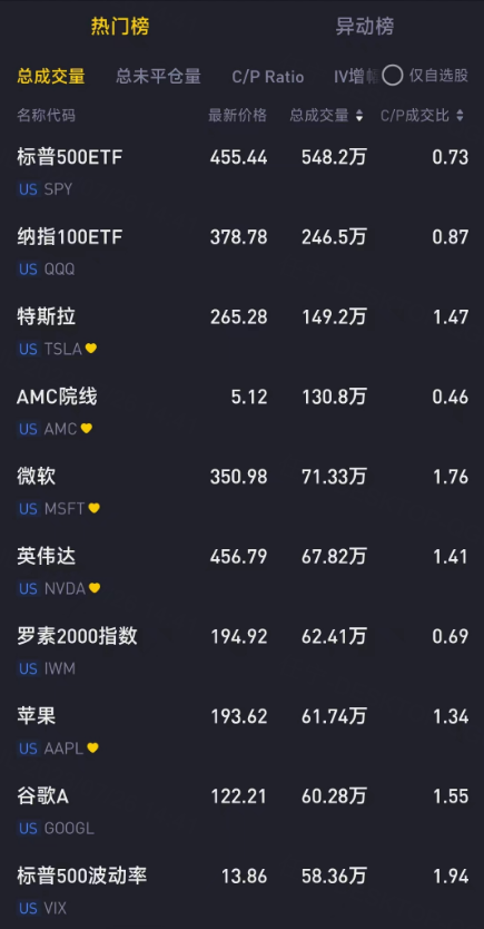 期权成交排行榜,特斯拉超越AMC院线,排在总榜单的第三位。AMC院线昨日大跌超12%,成交额维持高位。