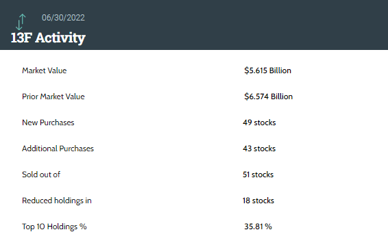 据统计,该基金第二季度持仓总市值为56.15亿美元,上一季度总市值为65.74亿美元,环比减少14.59%。该基金在第二季度的持仓组合中新增了49只个股,增持了43只个股。该基金还减持18只个股并清仓了51只个股。其中,前十大持仓标的占总市值的35.81%。