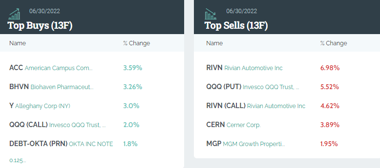 前五大卖出标的分别是:Rivian、纳指100ETF看跌期权(QQQ.US,PUT)、Rivian看涨期权、塞纳 (CERN.US)、MGM Growth Properties LLC(MGP.US)。