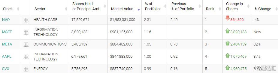在重仓股中,微软位列第一,持仓市值约为234亿美元,占投资组合比例为3.26%;标普500指数ETF(SPY.US)位列第二,摩根大通全球股票多元化回报ETF(JPGE)排在第三,苹果位列第四,亚马逊排在第五,持仓约1.07亿股,持仓市值约为113亿美元,占投资组合比例为1.58%。