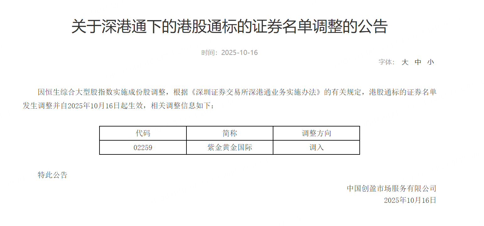 10月16日,紫金黄金国际盘初涨超6%,该公司被调入港股通标的证券名单。深交所发布公告称,因恒生综合大型股指数实施成份股调整,根据《深圳证券交易所深港通业务实施办法》的有关规定,港股通标的证券名单发生调整,调入紫金黄金国际(02259),自2025年10月16日起生效。