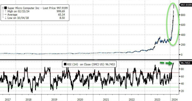 但与此同时,超微电脑的股票也出现了严重超买的现象。2月14日相对强弱指数(RSI)一度高达99。RSI衡量的是价格变动的幅度和速度,数值超过70即表明股票超买。因此,