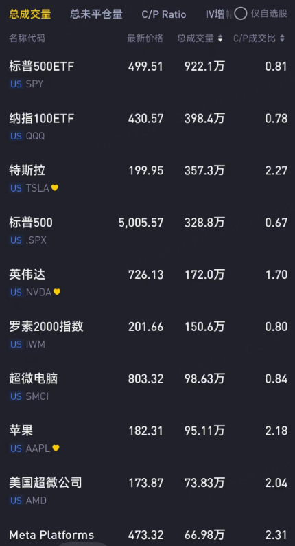 特斯拉继续排在个股期权成交量的第一位,英伟达紧随其后。特斯拉上周涨超3%,实现周线三连阳。而英伟达上周涨0.67%,周四、周五连收两根阴线,走势值得多头警惕。
