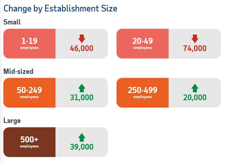 小型企业成为裁员重灾区。员工数少于50人的小型企业合计减少12万个岗位,其中20至49人规模的企业裁员7.4万人。相比之下,50人以上的大型企业净增9万个岗位,劳动力市场呈现明显分化。