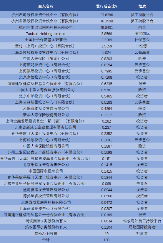 此外,半年后如果蚂蚁IPO估值缩水,这场上市狂欢最大的获利者——早期投资机构以及持有蚂蚁股票的阿里、蚂蚁集团高管和员工的获利将大大缩水。如上图所示,除员工高管持股40%、阿里集团持股约30%外,社保基金、马云的云锋基金、中金系、建银系、以及多家险资都是蚂蚁集团的早期投资者。