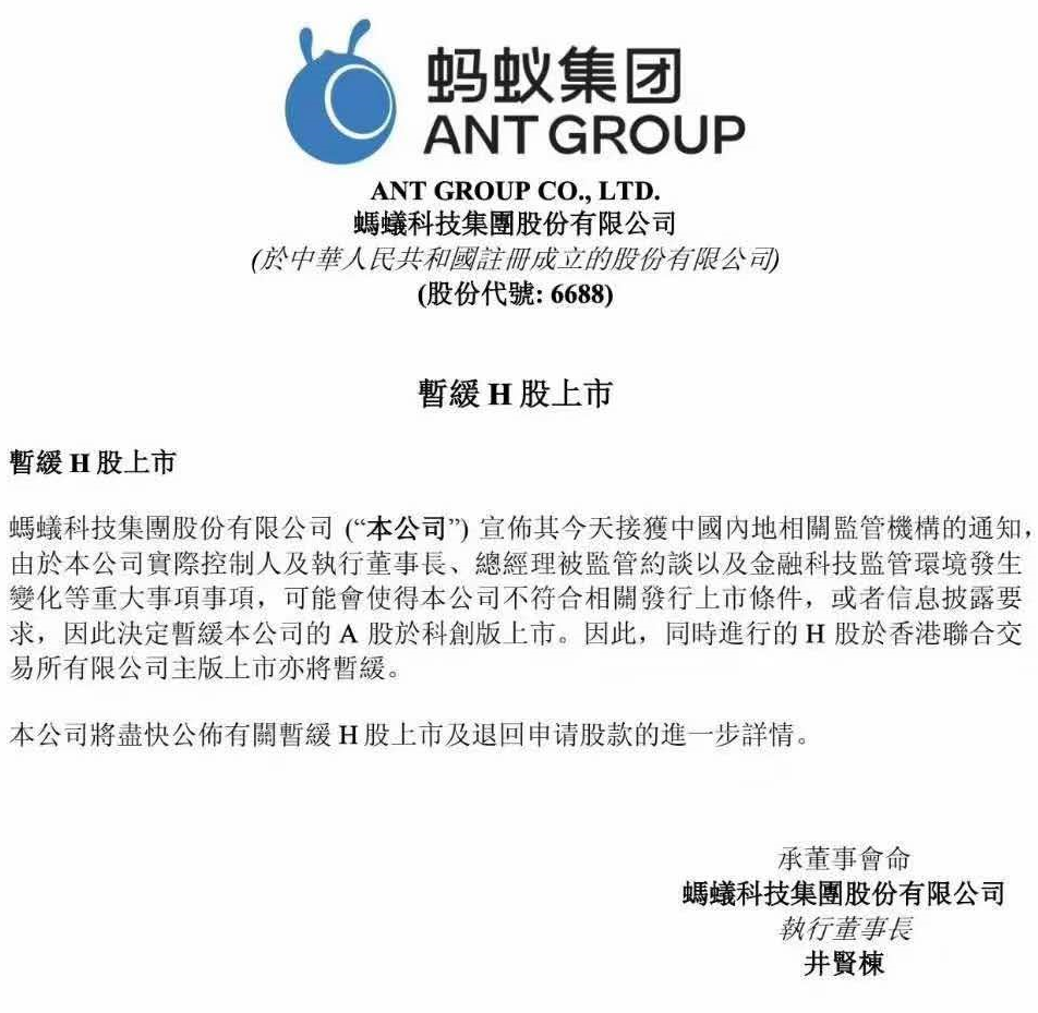 11月3日晚间,上海证券交易所官网发布《关于暂缓蚂蚁科技集团股份有限公司科创板上市的决定》,原定于11月5日在上交所科创板上市的蚂蚁集团被暂缓上市。随后港交所也发布公告,暂缓蚂蚁H股上市。
