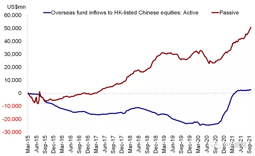 在被动型基金推动下,海外资金继续保持流入势头。上周海外主动型基金中有1亿美元资金流出香港股市,但被动型基金流入势头持续强劲,流入总量达到12亿美元。整体来看,上周共计11亿美元的海外资金流入香港市场,延续了8月份以来的稳定流入势头。