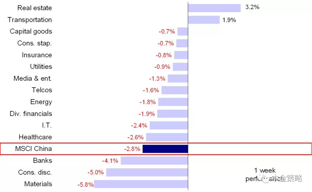 图表:MSCI中国指数上周上涨1.0%;原材料、多元金融、交运板块表现领先