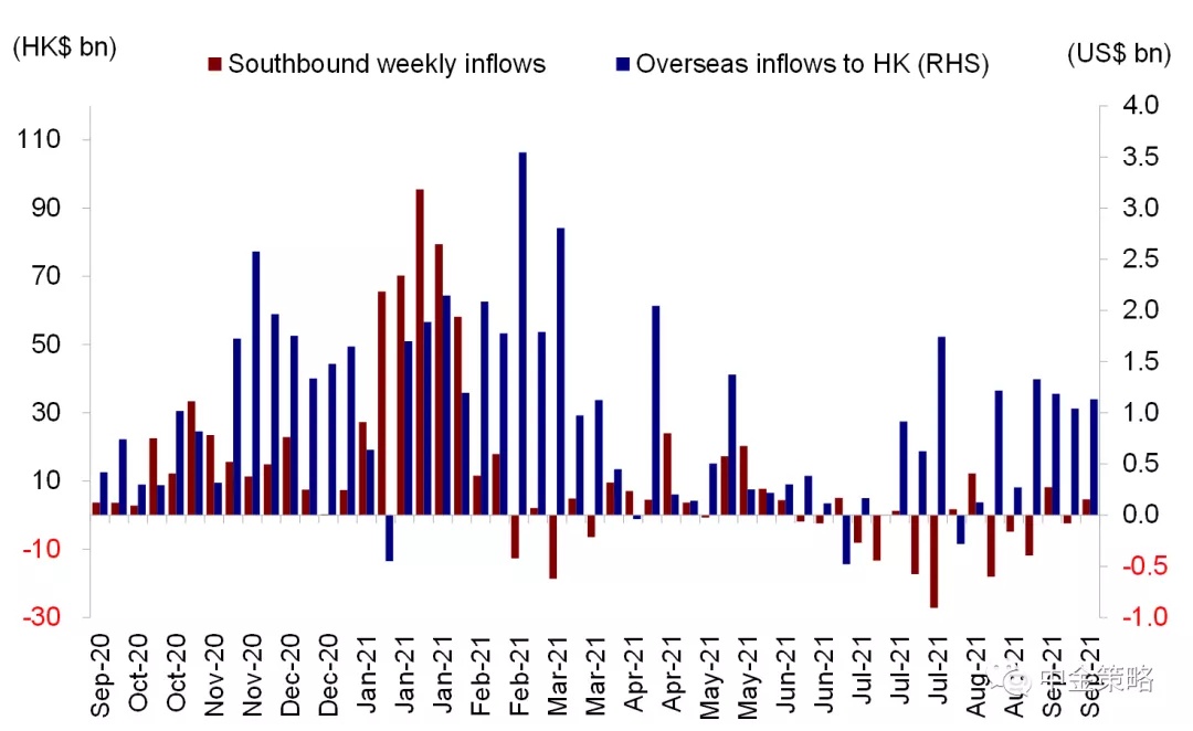 中秋节假期期间港股地产板块的剧烈波动引发市场明担忧情绪和大幅抛售,中资股市场走低。由于这一波动恰逢中秋假期国内市场休市,同时南向资金也暂停交易,使得港股市场更容易受外围情绪和环境的影响。根据我们与国内外投资者的交流情况,我们认为地产、保险和银行板块均一度遭受抛售所传递出海外投资者对出现系统性风险的担忧可能有些过度。其中的差异可能是由于明显的信息不对称所致,主要反映在以下几个方面:1)相关的问题已经持续发酵了一段时间,对国内市场来说并非是一个全新的话题,而海外市场最近的关注度才开始升温;2)政策方面在解决相关问题上有较为充足的应对手段和经验;3)国家多次声明守住不发生系统性金融风险是政策的底线。基于此,当市场逐步意识到可能并没有担心的那么严重后,港股市场和相关房地产股价在大幅抛售后出现了一定的反弹,南向资金周五大幅回流。