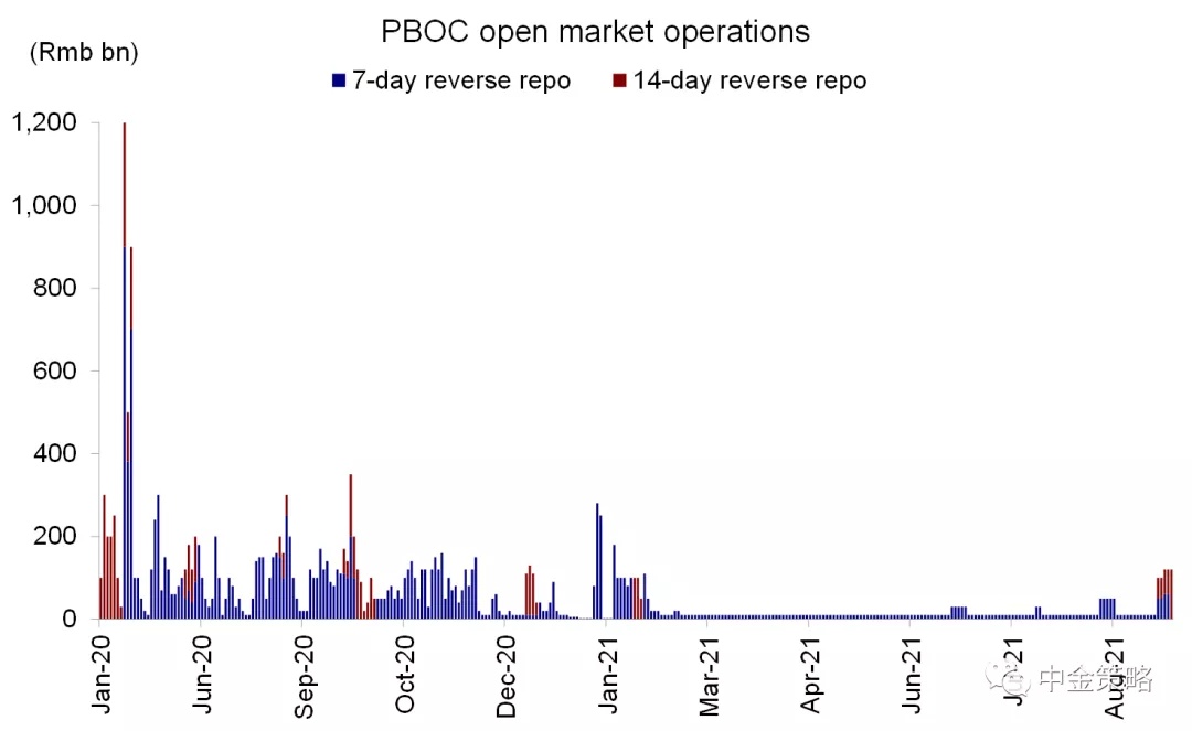 2) 在国庆长假到来前,中国央行向银行系统注入短期流动性。上周央行通过7天期和14天期逆回购向市场注入3600亿元的短期资金,为在国庆长假到来前向银行系统提供充裕的流动性。尽管7月和8月经济数据弱于预期,但央行持续保持谨慎,未向市场注入过多的流动性。