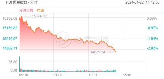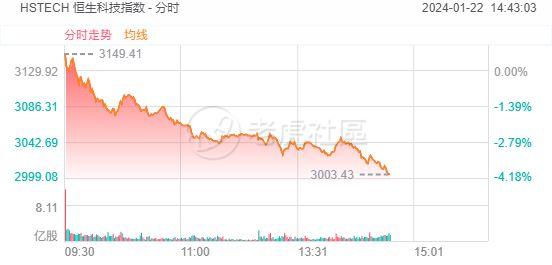 1月22日,港股持续走低,恒生指数跌幅达3%,恒生科技指数跌幅达4%;