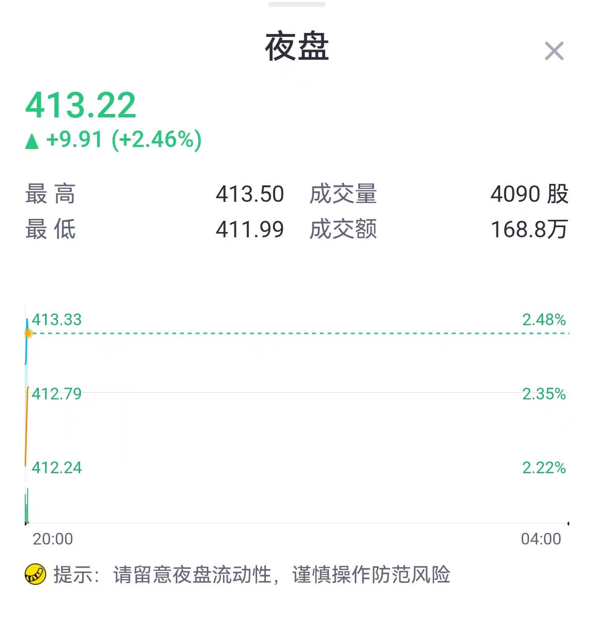本周二(1月14日)美股夜盘时段, 特斯拉 续涨超2%,截至发稿报413.22美元,涨幅2.46%: