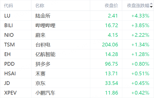 中概股夜盘普涨,截至发稿 陆金所 涨超4%, 哔哩哔哩 涨近4%, 蔚来 涨超2%:
