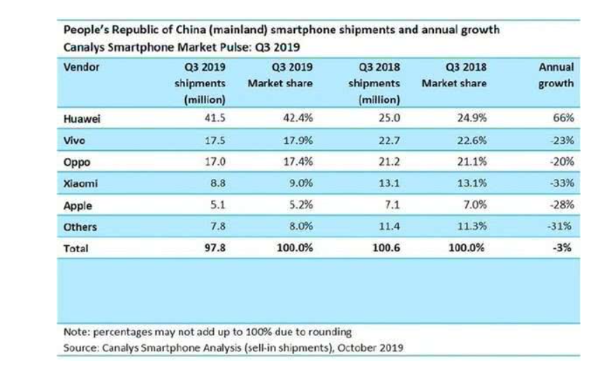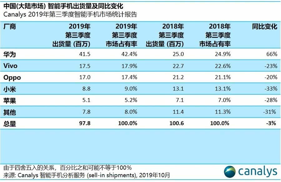 所谓前有强敌后有追兵,如今小米的处境有些进退两难。虽说中国市场是小米的“福地”,但调研机构的数据却令人无法安心:Canalys表示,2019年Q3的中国市场中,除了华为的出货量有提升下,其余的前五品牌均有下滑,而小米的下滑幅度更是达到了33%之多。