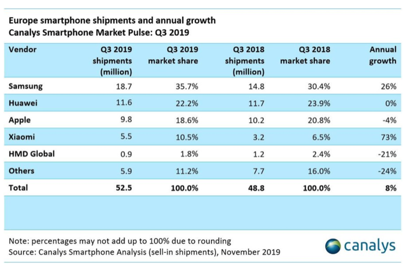而实际也是如此,Canalys在11月下旬公布了2019年Q3欧洲智能手机市场的数据统计情况,小米毫无疑问地成为了一匹黑马:市场份额达到了10.5%,增长幅度达到73%,已经成为了三星、华为和苹果之后的第四大手机厂商。