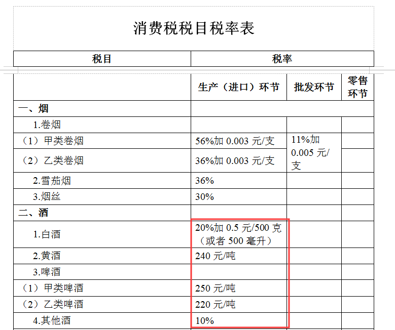 从征求意见稿来看,本次最受关注的酒类消费税仍在“生产(进口)环节”,其中白酒税率为20%加0.5元/500克(或者500毫升);黄酒为240元/吨。