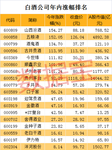 证券时报·数据宝统计显示,白酒指数年内累计涨幅高达91.4%,位居细分行业涨幅榜前五位。白酒公司年内股价全线上涨,7家公司年内股价翻倍,分别是山西汾酒、五粮液、酒鬼酒、古井贡酒、今世缘、顺鑫农业、泸州老窖。