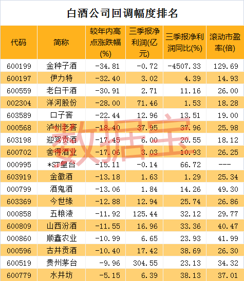 将时间轴放长至全年来看,业绩表现一般的白酒股回调幅度更大。证券时报·数据宝统计显示,金种子酒、伊力特、老白干酒、洋河股份、口子窖较年内高点回落幅度超过20%,其中金种子酒回落幅度34.81%居首。金种子酒前三季度净利润亏损0.72亿元,是白酒公司中亏损金额最大的。伊力特、洋河股份前三季度净利润增幅均不足10%,而老白干酒、口子窖三季报净利润增速均降至五年来最低水平。