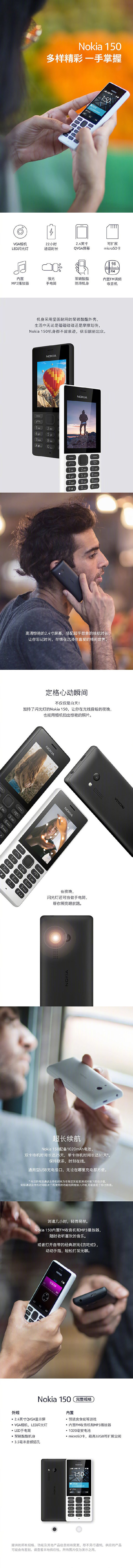 据官方的海报了解到,诺基亚150是一款采用直板造型的手机,内置1020mAh电池。这样的电池容量放在今天似乎并不值得说道,但是在这款手机上可实现25天的双卡待机时间,30天的单卡待机时间以及22小时的通话时长,机身底部设有通用型充电接口。