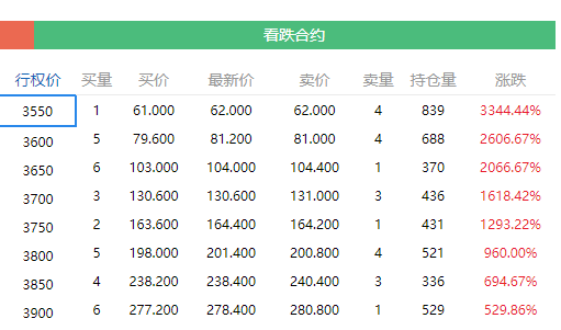 2月3日消息,大盘午后持续低迷,中金所沪深300看跌期权集体大涨,截至发稿,5只合约涨幅超过1000%,行权价在3550看跌合约大涨3344%
