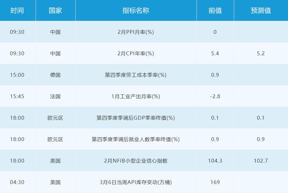 3月10日周二关键词:中国CPI,欧元区四季度GDP,EIA月报,API原油库存报告