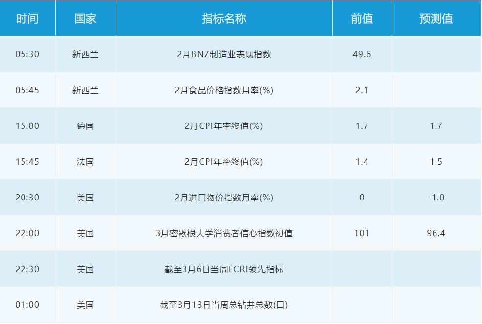 3月13日周五关键词:德国CPI,美国消费信心数据,当周钻井平台数据
