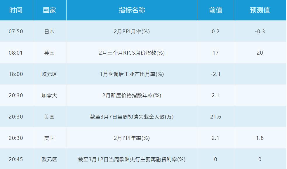 3月12日周四关键词:欧元区工业产出,美国PPI,欧洲央行利率决议