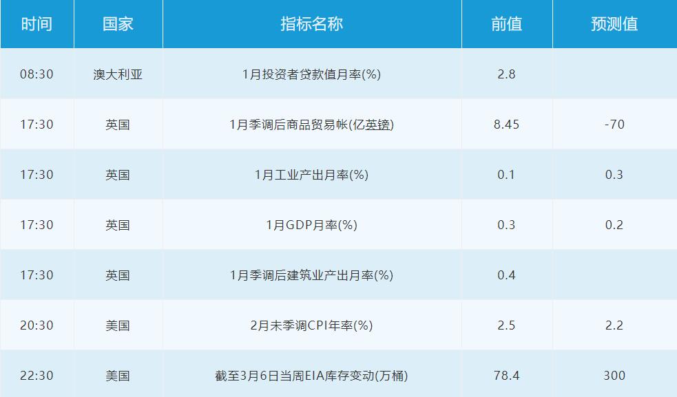 3月11日周三关键词:英国GDP,英国工业产出,美国CPI,美国EIA原油库存