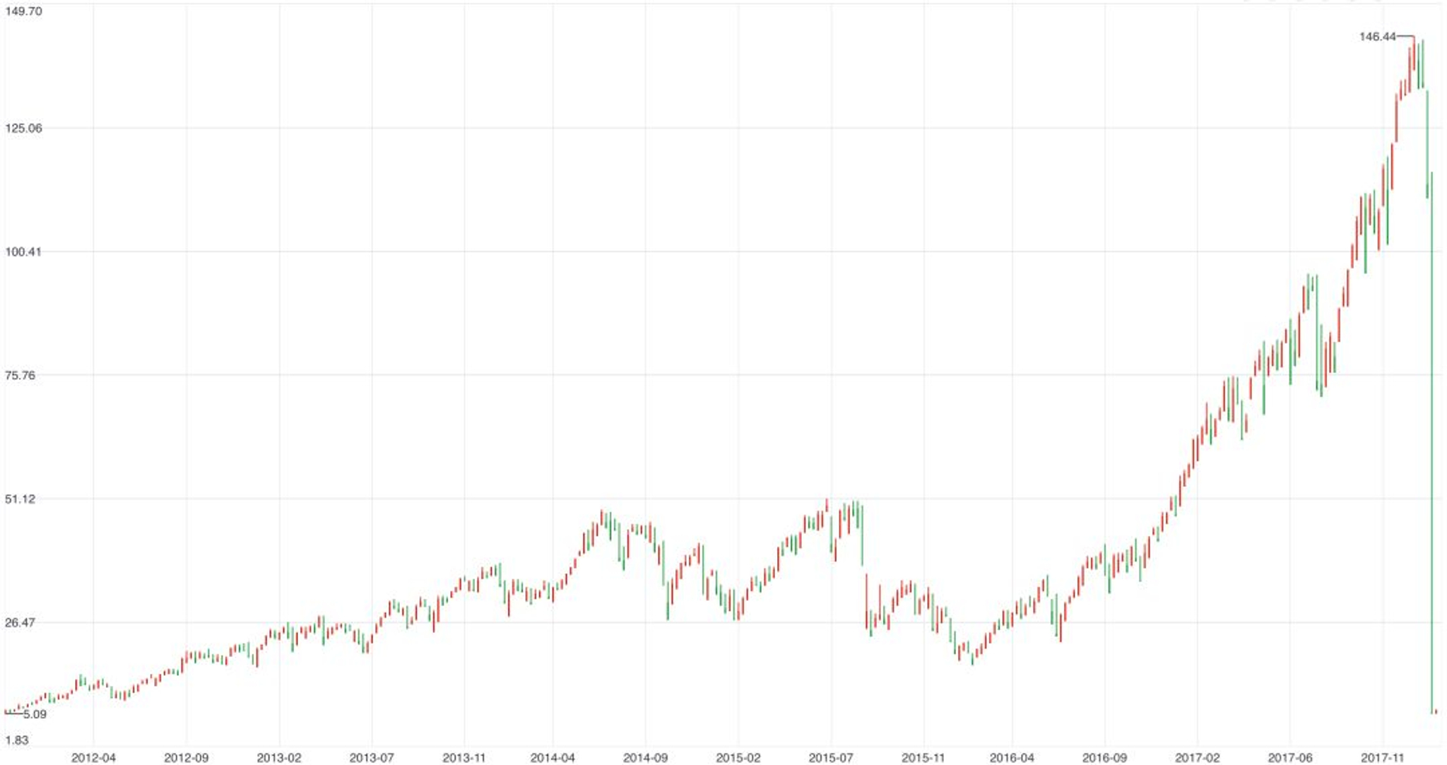 买入XIV就变得像卖保险一样,在无事发生的时候不断地积累小钱。恰逢前些年美国股市走出了很长一段时间的低波动行情,XIV从成立之日起的7年时间里翻了15倍(图2)。当然风不会一直平浪不会总是静,2018年2月5日标普500急跌,创2011年8月份以来最大单日内跌幅4.1%,VIX暴涨且期货从升水变为贴水(当月合约价格飙升)。虽然这个单日跌幅在历史上并不是千年一遇,但由于XIV等同类基金的规模已经翻了数倍,XIV管理人不得不买入巨额的期货应对这个情况。在此同时,投资者因为担心此类基金无法承担如此大量的买单,同时自己也在大量买入看跌期权寻求保护,最终导致合约价格螺旋式上升。面对如此巨大的对冲风险,瑞士信贷使用了提前终止XIV运作的权力(这次的VIX暴涨符合合同条款里的所描述的“加速事件”,即acceleration event),将所有现有资金清算退回投资者,XIV多年的累计收益一夜灰飞烟灭(从超过$100每份的价值瞬间变为最后的约$6每份)。这个事件除了给发行人瑞士信贷和德意志银行(Deutsche Bank)、摩根斯坦利(Morgan Stanley)等一批投资机构造成了不小的损失外,许多个人投资者也未能幸免。在当时美国某论坛上有人发了一段话,讲述了他通过交易XIV在三年时间内从5万美元的本金翻到了400万美元,却在今年亏掉了所有钱的经过,其中包括募集来的150万美元。