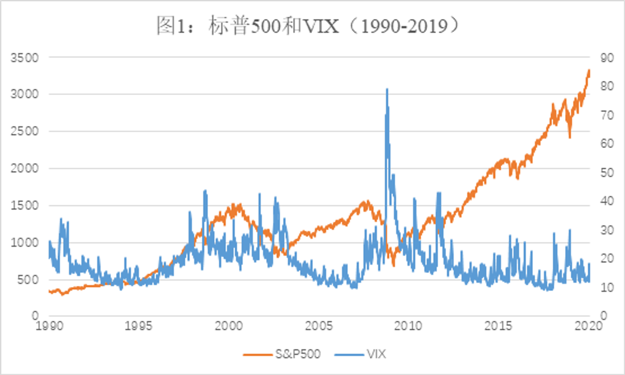 VIX或者说波动率指数的理论工作起源于Menachem Brenner和Dan Galai两位教授在1989年开始发表的一系列文章[1]。时为股灾刚过不久,投资者对表征市场波动率的需求强烈。之后CBOE聘请Robert Whaley教授编制VIX指数并在1993年正式推出。VIX的计算主要借助了指数期权,因为指数本身并不能很好地反映投资者预期。最初的VIX是通过标普100指数平价期权的价格推算,而我们现在所熟知的VIX计算方法是CBOE在2003年与高盛公司(Goldman Sachs)一起更新奠定的。新计算方法的基准由标普100改为更具美国市场代表性的标普500,使用了多个行权价格的认购认沽期权,并且采用更加稳健的新定价模型计算。具体计算方法可参阅CBOE VIX的白皮书[2]。从计算方法上定性来看,看跌(看涨)期权价格上升(下降)时,VIX指数走高,反之则反。