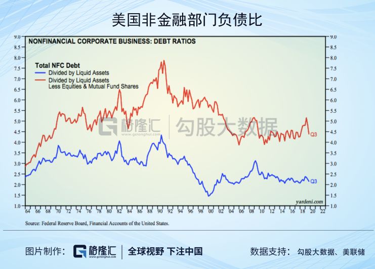 从美国非金融企业的负债/流动资产和非金融企业的负债/流动资产-股票以及持有的共同基金这两个指标来看,美国非金融企业的债务压力在近50几年的历史上都是比较小的。